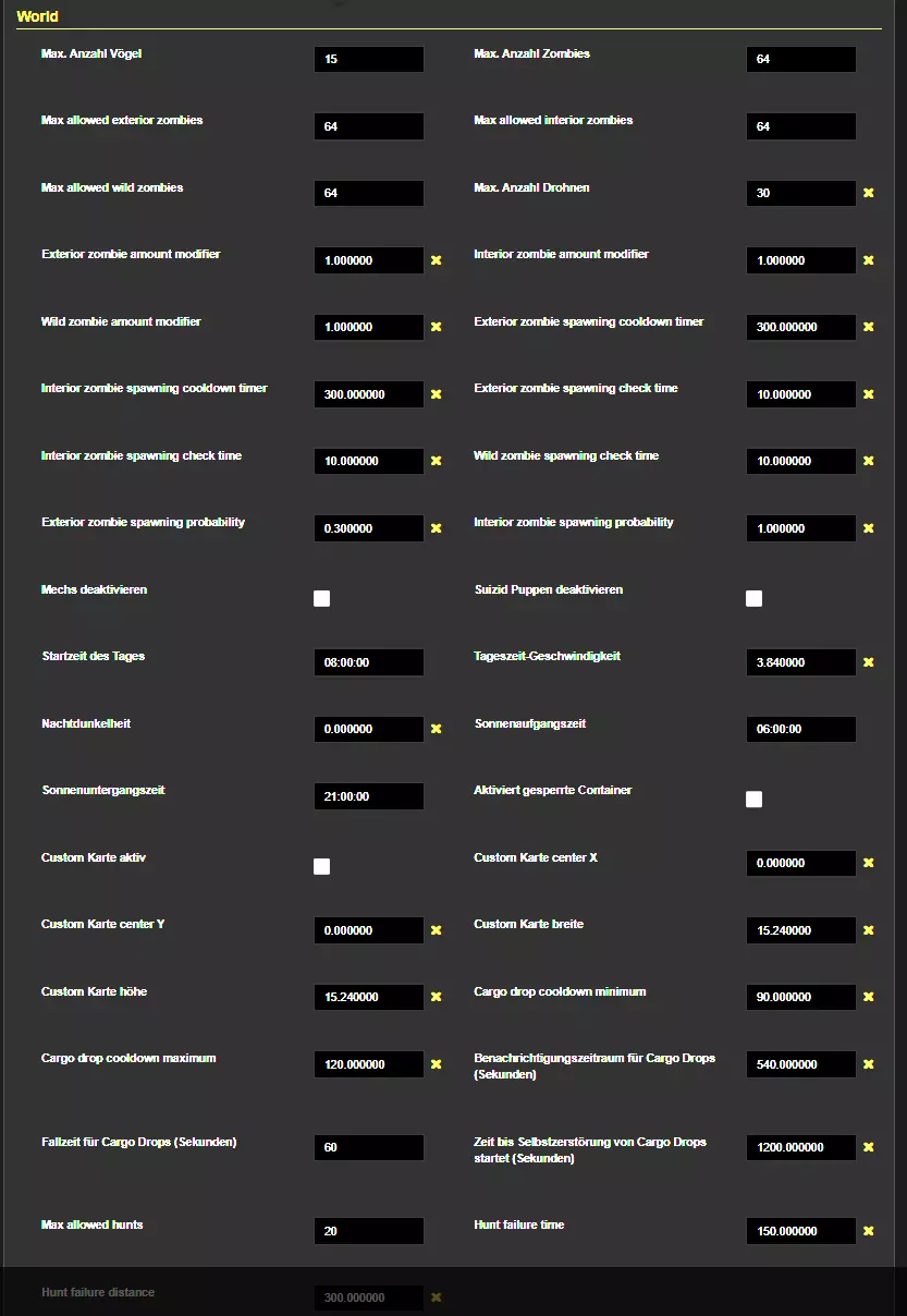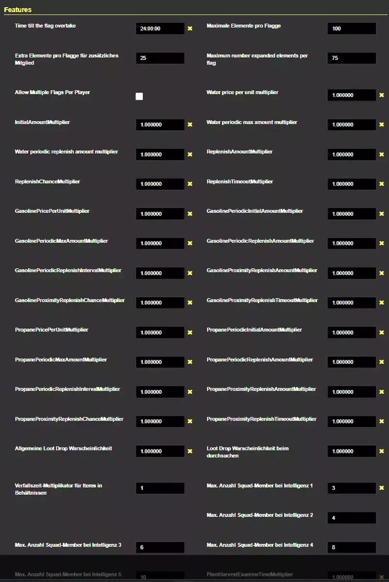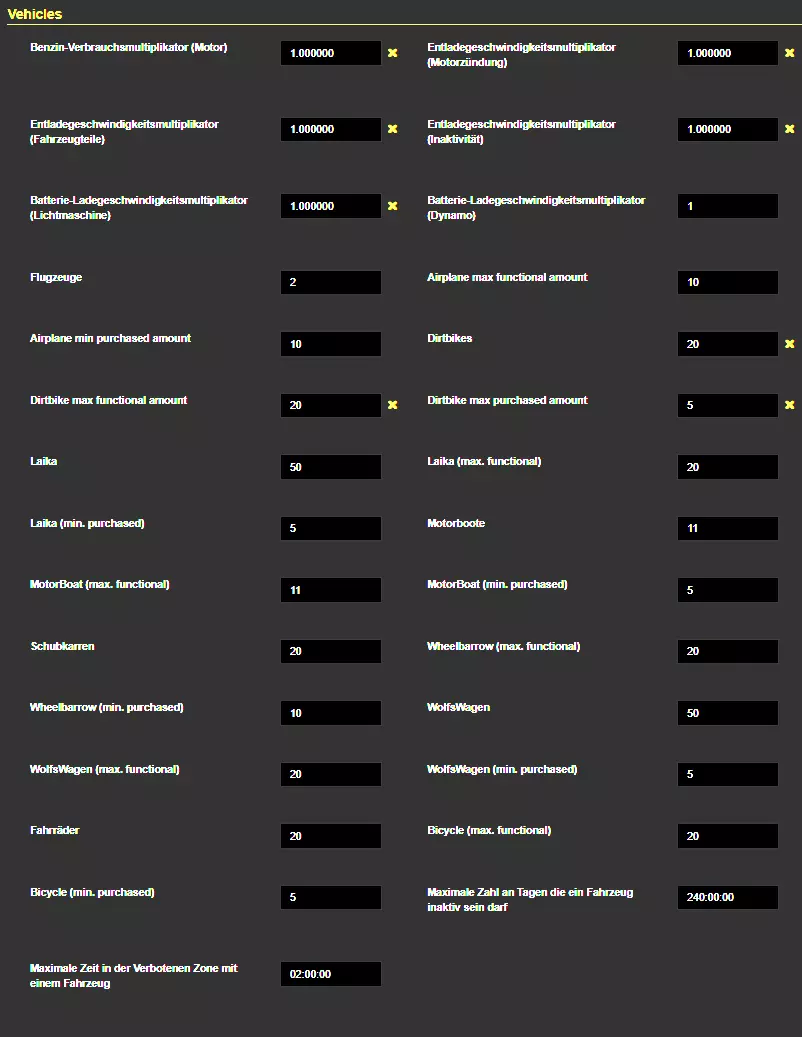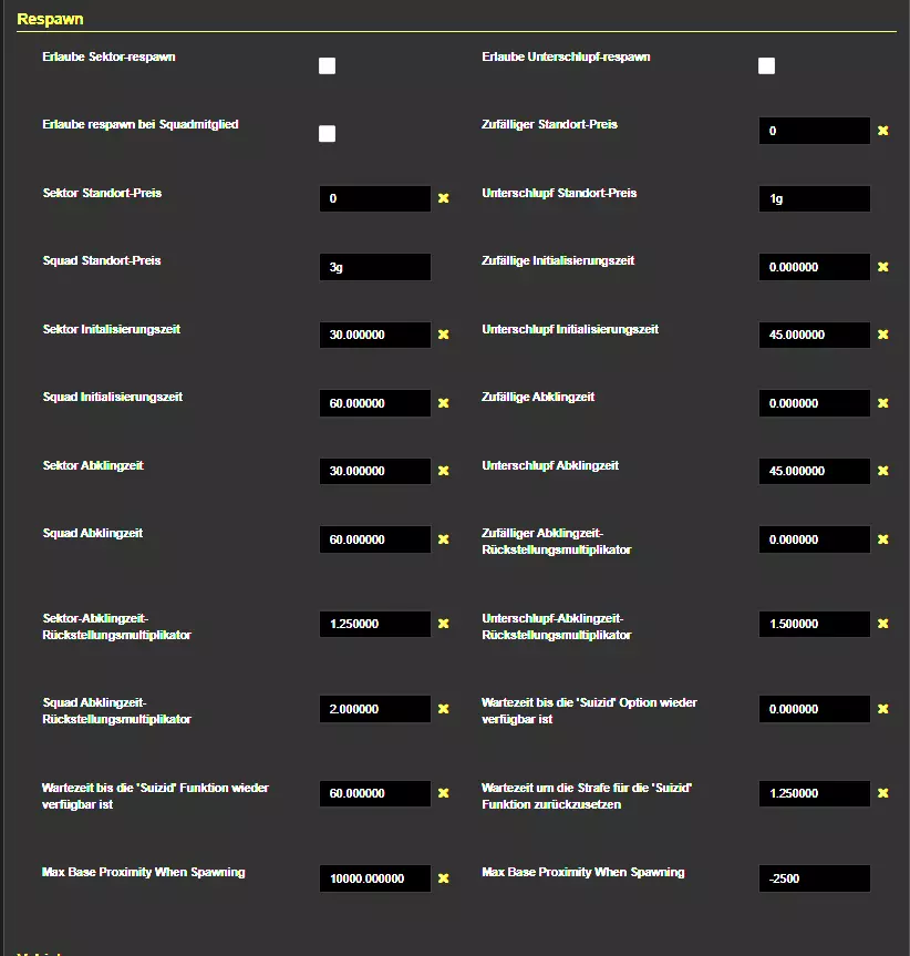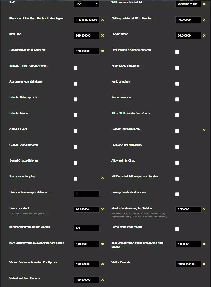 An den Standard Servereinstellungen habe ich nicht wirklich was geändert. Eigentlich nur den Max Ping auf 999 gestellt und die Respawnkosten auf 0. Ansonsten die Voreinstellungen.