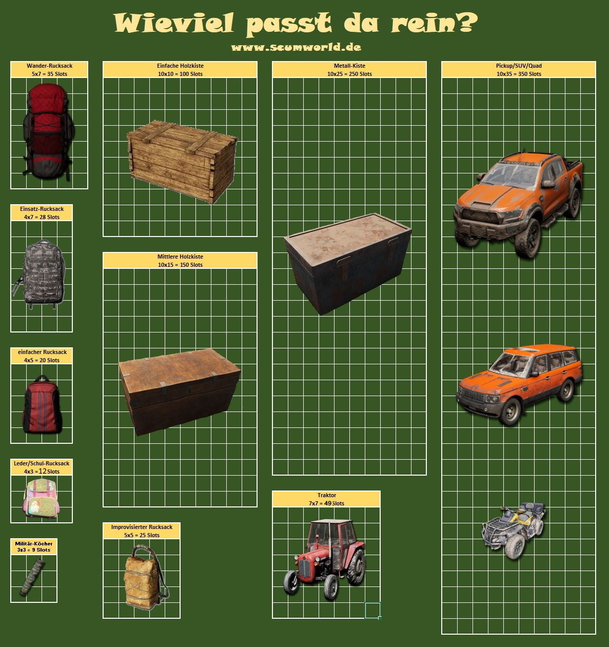 Wir haben euch hier mal eine kleine Übersicht gebaut, in der die größeren Behälter in Scum mit ihren vorhandenen Slots verglichen werden. Interressanterweise wurde scheinbar die Kapazität der Fahrzeuge (wieder) vereinheitlicht. So ist es egal, ob man mit Quad, SUV oder Pickup unterwegs ist - die Anzahl der Slots ist identisch.