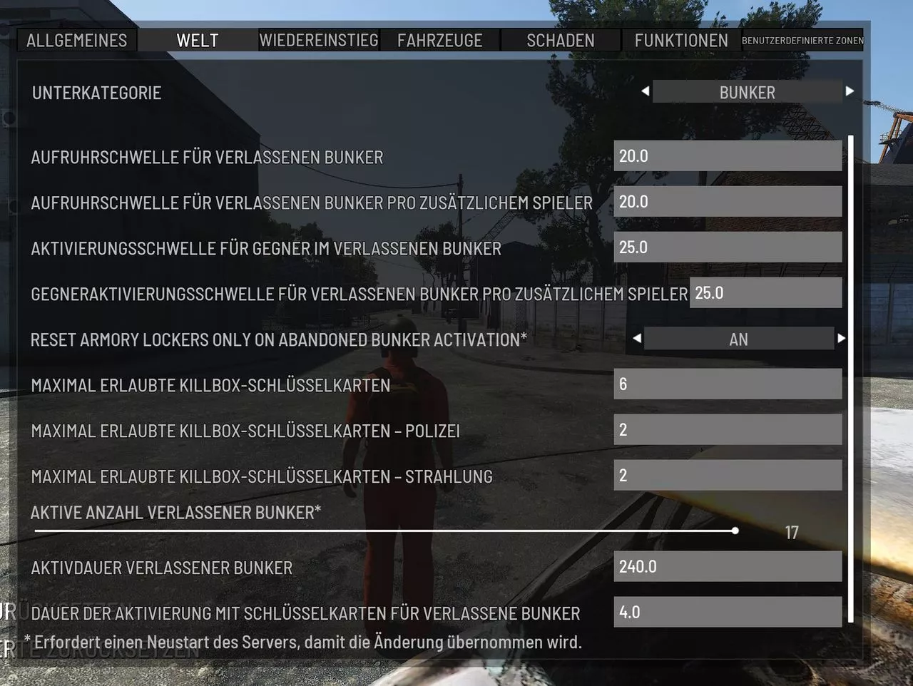 Ich habe meinen Server recht gut eingestellt, nur die Bunkereinstellung bekomme ich irgendwie nicht hin. Erst waren im Bunker Kaum Puppen/Razor, dann ist nichts zum looten da gewesen. Nach ein paar Youtube Tutorials habe ich nur die ersten 50 Meter überlebt ( Bin zwar noch kein Profi, aber als anfänger würde ich mich auch nicht bezeichnen und trotzdem hatte ich null Chance in der 2 Bunkereinstellung)