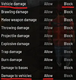 Hämmere ich damit volle Kanne gegen einen Baum, bekommt das Fahrzeug keinen Schaden. (Das scheint in Vehicle damage gerutscht zu sein, anstatt in damage to vehicles, denn stelle ich vehicle damage auf allow, bekommt das FZ schaden bei crash) Ich möchte nur nicht, dass man andere überfahren kann, was "Vehicle Damage" ist.