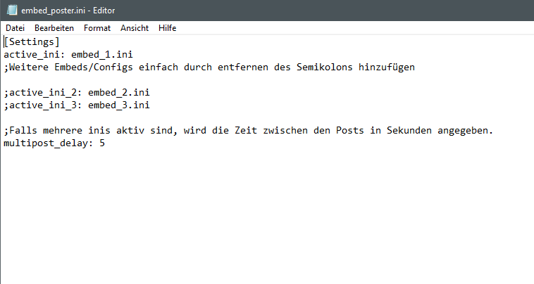 Pro-Tipp: Mehrere Embeds? Einfach Zeilen entkommentieren und multipost_delay anpassen (Wartezeit zwischen Posts).