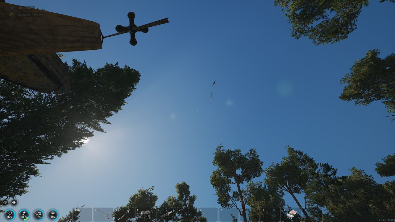 Nach ein bisschen suchen dann die Idee "Bäume fällen" gesagt getan und da schweben sie die guten Waffen. Bisher waren die Waffen immer am Boden auffindbar.