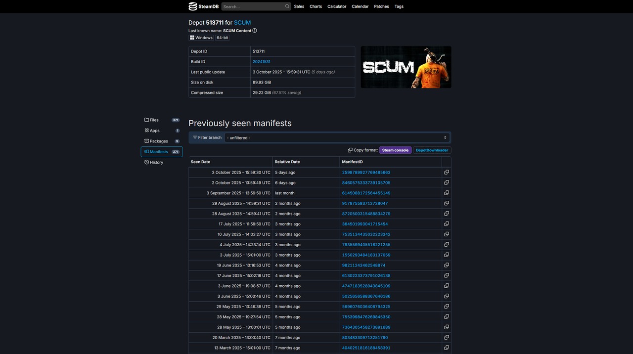 - Dies stellt die unterschiedlichen Versionen von SCUM dar, jedes Manifest ist ein Snapshot einer SCUM Version und stellt somit eine eigenständiges Build Ihrer Größe dar, die man sich mit Hilfe eines einfachen Batch Scripts downloaden kann.