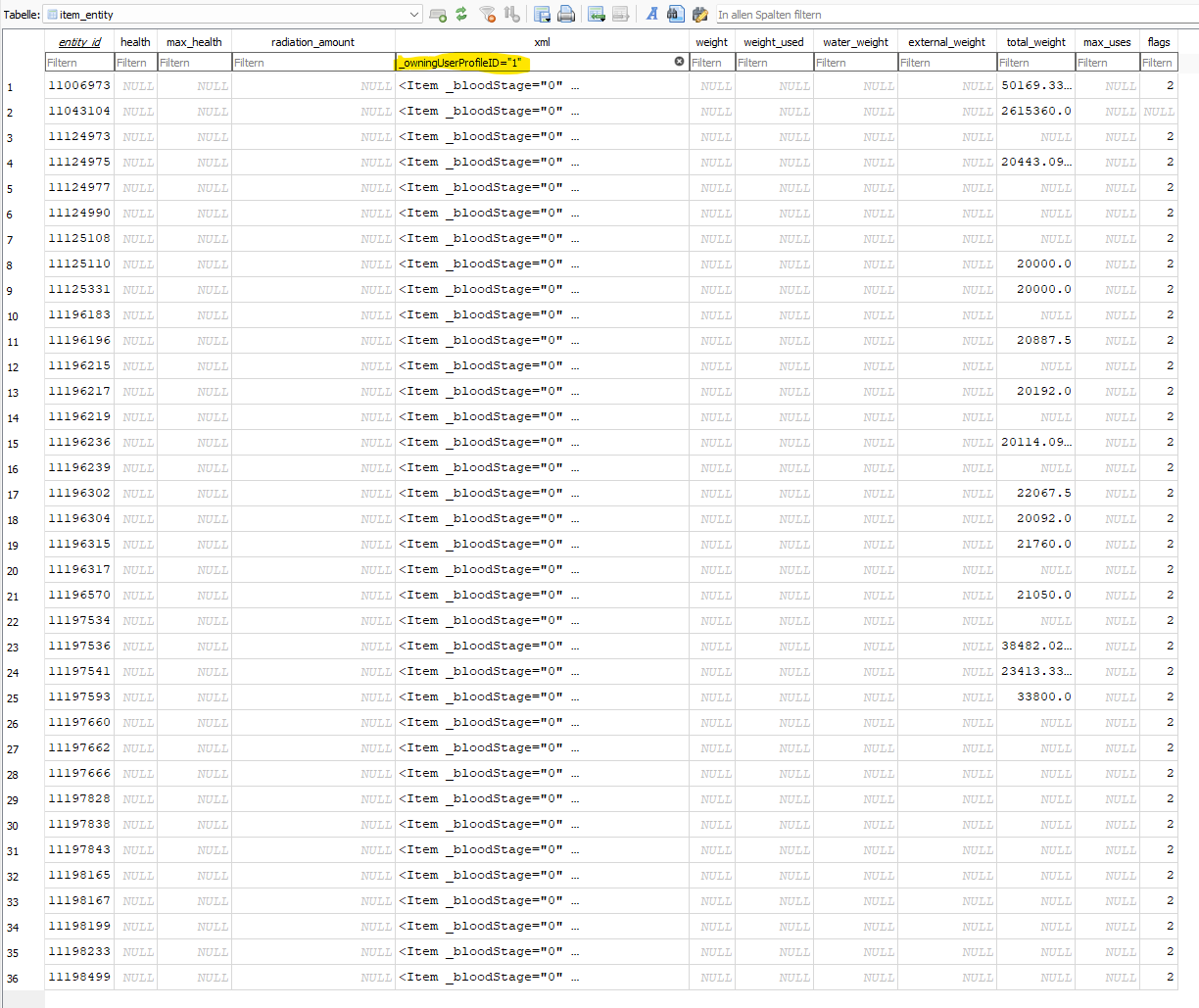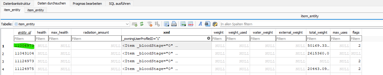 Danach gehen wir in die Tabelle item_entity und suchen in xml nach folgendem: