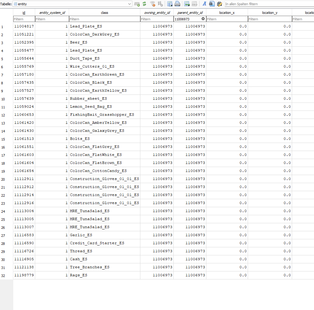 Wenn wir jetzt anstatt in der id Spalte in der parent_entity_id suchen, finden wir alle Items die in dieser Kiste sind.