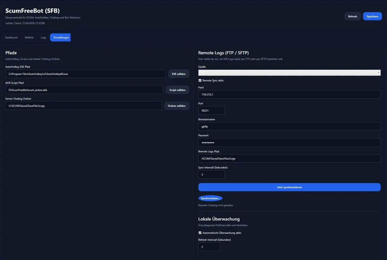 Um den Bot zu starten müsst ihr erst Scum ausführen, in den Videosettings auf windowmode stellen, auf den Server connecten und den Chat auf Global Stellen. Dann den Bot ausführen.