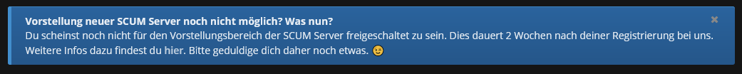 Aufgrund mehrerer Nachfragen, wann man denn eigentlich der Vorstellungsbereich für SCUM Server freigeschaltet wird, habe ich soeben den Hinweis dafür überarbeitet: