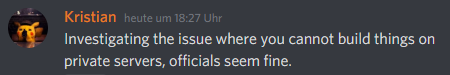 Scheinbar ist es egal, ob die Baubeschränkungen innerhalb der Server-Einstellungen aktiviert oder deaktiviert sind. Diese Einstellung scheint so oder so nicht nach dem Patch zu funktionieren.