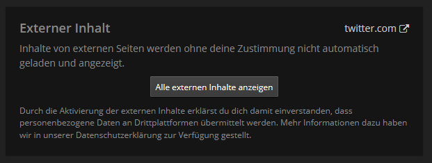 der eine oder andere hat es im SCUM Newsticker schon erkannt. Seitdem wir im August 2020 (hier zum Nachlesen) auf eine neue Version der Forum Software umgezogen sind, werden externe Inhalte, also Twitter-Posts, YouTube-Videos oder andere externe Anbieter-Einbindungen, erst nach einer Bestätigung angezeigt. Diese Zustimmung kann entweder bestätigt oder eben abgelehnt werden. Trifft zweiteres zu, werden euch diese Inhalte eben nicht angezeigt und ihr erhaltet diesen Hinweis: