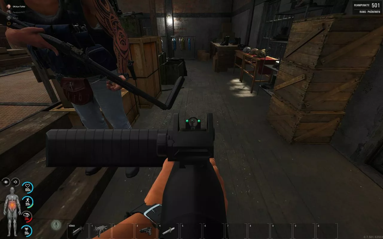 wenn ich mich mit den Tab Actions hinlege oder setzte komm ich mit F oder Leertaste wieder rausFlashlight geht bei mir auch nicht mehr mit shift+e, anscheinend geht das nur noch das man es im Inventar einschaltet, aber das geht bei mir nicht, weil wenn ich die Waffe in der Hand hab und dort das Dropdown Menü aufmache verschwindet das Turn on unten im Bildschirm. Wär schön wenn dafür auch jemand ne Lösung hätte.