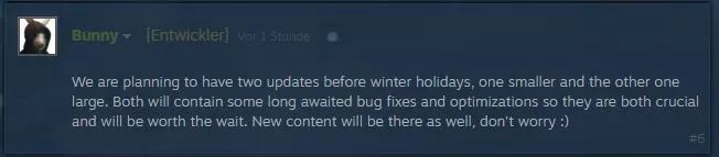 Bunny gab heute im Steam-Forum einen kleinen Ausblick, wie aktuell die Planung ist. Demnach werden wir, wie an anderer Stelle schon vermutet, noch ein oder zwei Zwischen-Patches bekommen, bevor 0.7 uns erreicht. Vor den Winterferien soll uns demnach ein kleineres und ein großes Update erwarten, bei dem es sich dann durchaus auch schon um 0.7 handeln kann. Die Winterferien beginnen in Kroatien Ende Februar, davor liegen aber auch noch die Weihnachtsferien ab 24.12. Wir versuchen noch herauszufinden, auf welche sich Bunnys Aussage bezieht.