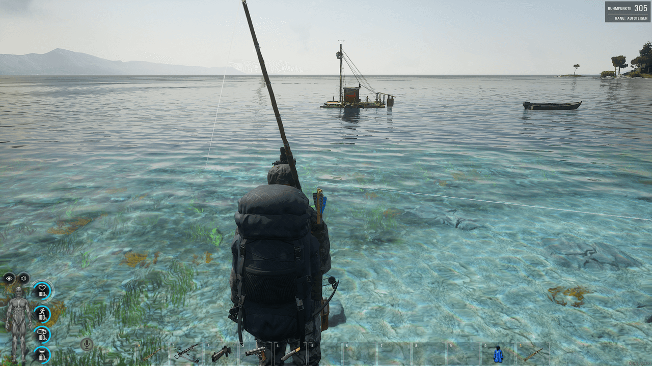 Wenn ich das Angel-Minigame abbreche dann sieht es wie folgt aus....der helle Strich vom Kopf nach rechts verlaufend ist die Schnur welche irgendwo an Land endet. -
