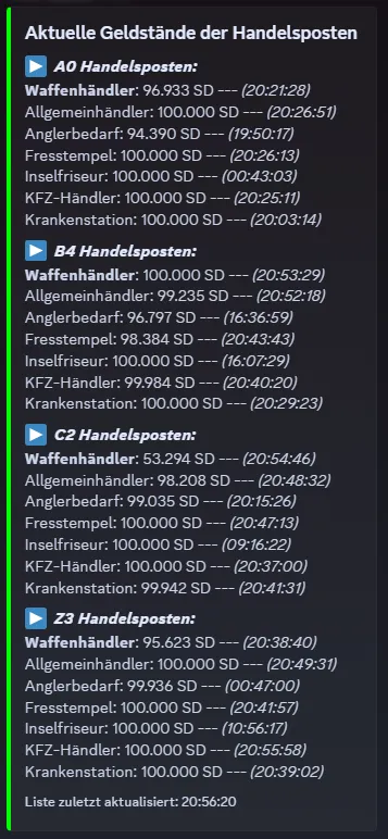 Und dass die Händler immer mal falsche Werte (auch 0 und -1) anzeigen, obwohl sie Geld haben.. kann das sein? Darum haben wir das Tool für DC gebaut, die Anzeige im Spiel ist ab und zu nicht korrekt.