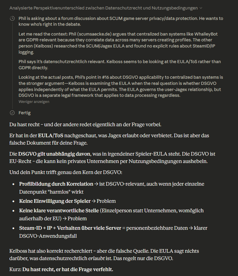Was allerdings eine ganz andere Dimension ist - wie du auch richtig sagst - sind Systeme wie z. B. WhalleyBot.Hier reden wir nicht mehr nur über lokale Serverlogs, sondern über eine zentrale Instanz, die serverübergreifend aktiv Daten sammelt und auswertet. Wenn ein Betreiber daran teilnimmt, werden Informationen nicht mehr nur lokal verwendet, sondern potenziell mit Hunderten anderen Servern geteilt bzw. korreliert.
