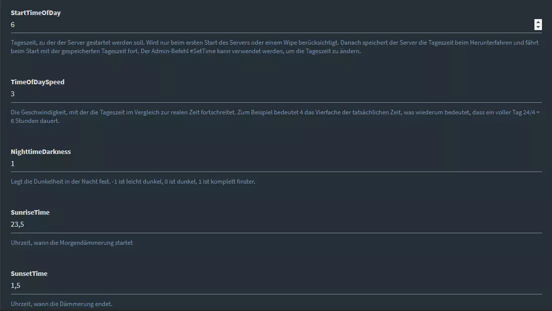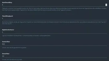 noch eine andere frage gebe ich bei TimeOfDaySpeed: 4 ein dann ist ein ingame tag 6 std realzeit richtig? was gebe ich bei sunrisetime und sunsettime ein, wenn ich nur 30 min nacht haben möchte?