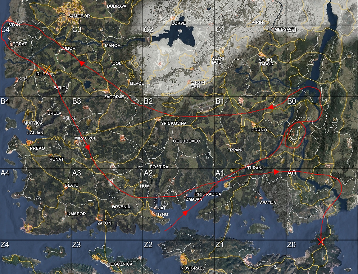Mit dem Wasserflugzeug in Z2 gestartet, über A1 nach B0 geflogen. Eine Schleife um das Krankenhaus gedreht, hoch über C0 nach B1 und von dort im Bogen nach C4. Kurz D4 angerissen und im großen Bogen über B4, B3, A3, A2 A1 und A0 nach Z0. Im Landeanflug auf den Flughafen Z0 - plötzlich „disconnect“. Ladebildschirm und ich finde mich im Hauptmenü wieder. shi…, schon wieder unsinnig gestorben. Aber ok.