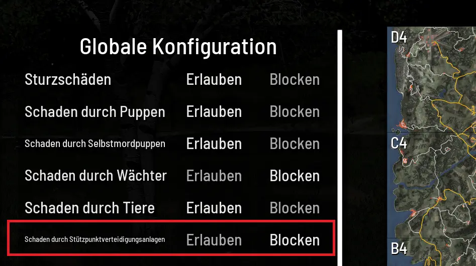 Schaden durch Stützpunktverteidigungsanlagen: Damit schaltet man den Stacheldrahtschaden ein/aus. Der Schaden der Geschütztürme lässt sich über den SCHADEN DURCH WÄCHTER deaktivieren. Jedoch machen dann Mechs und Dropships auch keinen Schaden mehr. Ich finde die Idee für PVE aber nicht schlecht, den Geschützturmschaden mit über "Schaden durch Stützpunktverteidigungsanlagen" laufen zu lassen. Könnte man mal so weiter geben.
