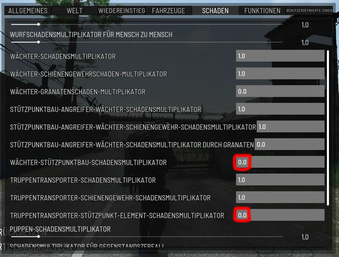 Die Einstellungen unter Schaden für den Stützpunkt-Element-Schadensmultiplikator des Dropships und des Mechs jeweils auf 0.0 eingestellt.