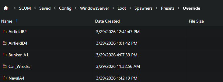 Ich weiß nicht was bei mir falsch läuft.Habe deine Datei in den Override Ordner kopiert \gameserver\SCUM\Saved\Config\WindowsServer\Loot\Spawners\Presets\Override