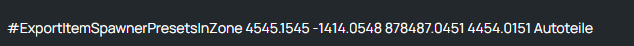 Im Chat dann #ExportItemSpawnerPresetsInZone "X-Koordinate" "Y-Koordinate"(TopLeft) "X-Koordinate" "Y-Koordinate""BottomRight"" "NameDeinesGewünschtenOrdners"(Wird erstellt)