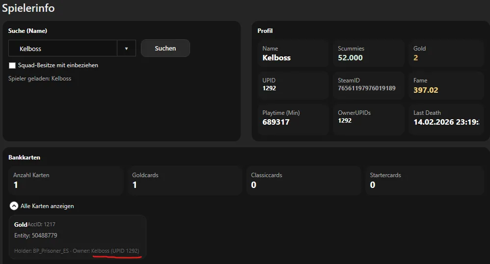 Frage: Spielerinfo muss man jedes einzelnes Nickname eingeben ? Kann es nicht alle Spieler beim DB hoch / neu laden gleich alle anzeigen ;damit Admin nur scrollen und aussuchen muß und nicht einzelnes Nickname eingeben jedes Mal.
