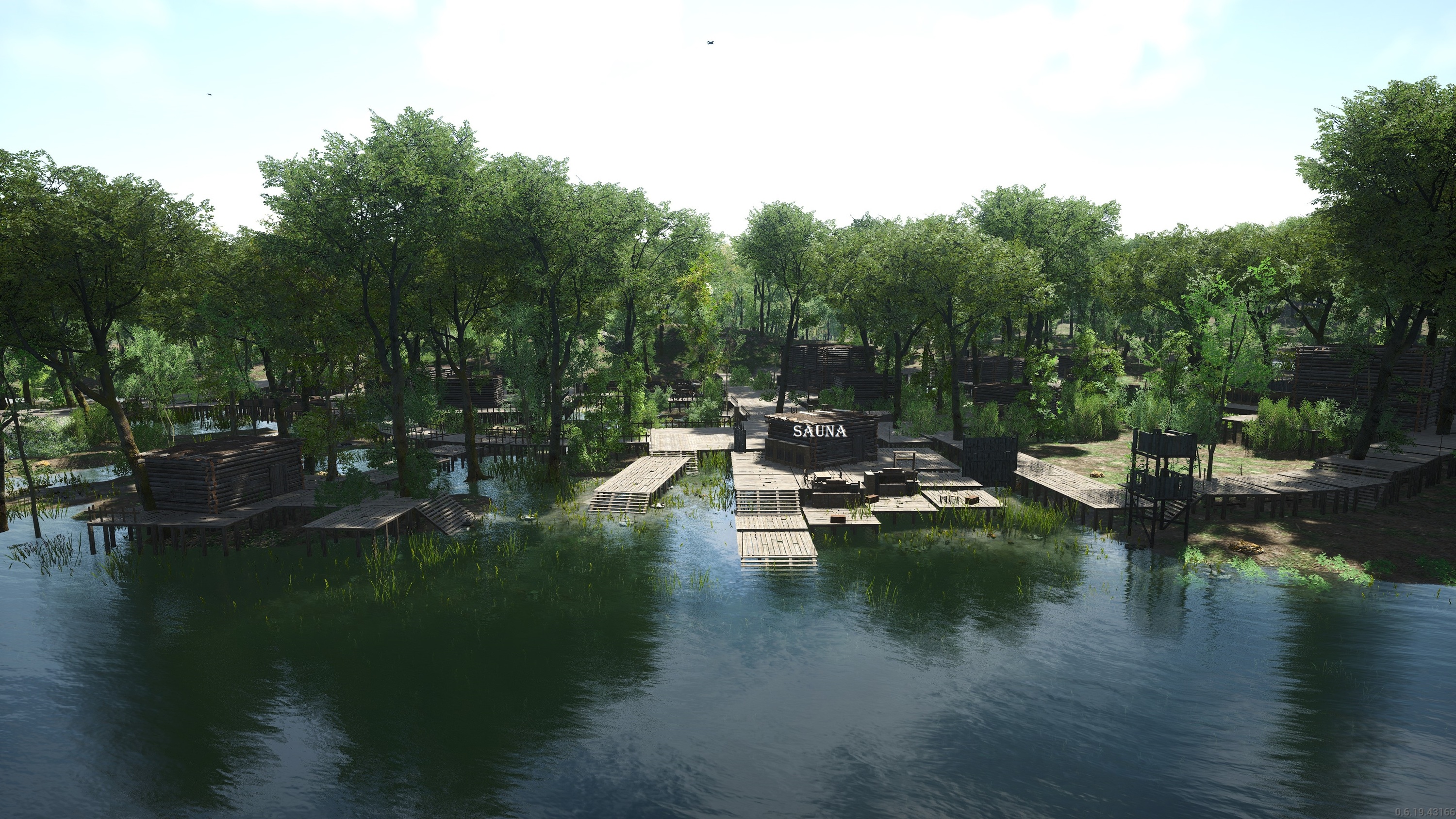 Mein Plan war es eine "Sumpfbasis" zu bauen mit Stegen zwischen den einzelnen Hütten. Aufgrund des teilweise doch sehr feuchten Untergrunds waren Stege nur in Fundamentgröße möglich. Naja und die kleine Hütte am Ufer hatte irgendwann keinen Zweck mehr, weshalb ich kurzerhand die Sauna da rein gebaut hatte.