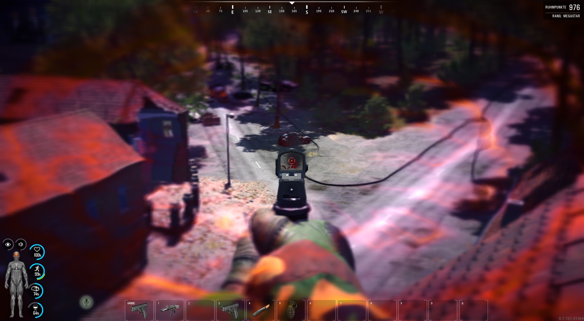 ...lilafarbene Halluzinationen, um dann in einem, ach so, die Pistole in der Hand sieht noch normal aus, um dann...