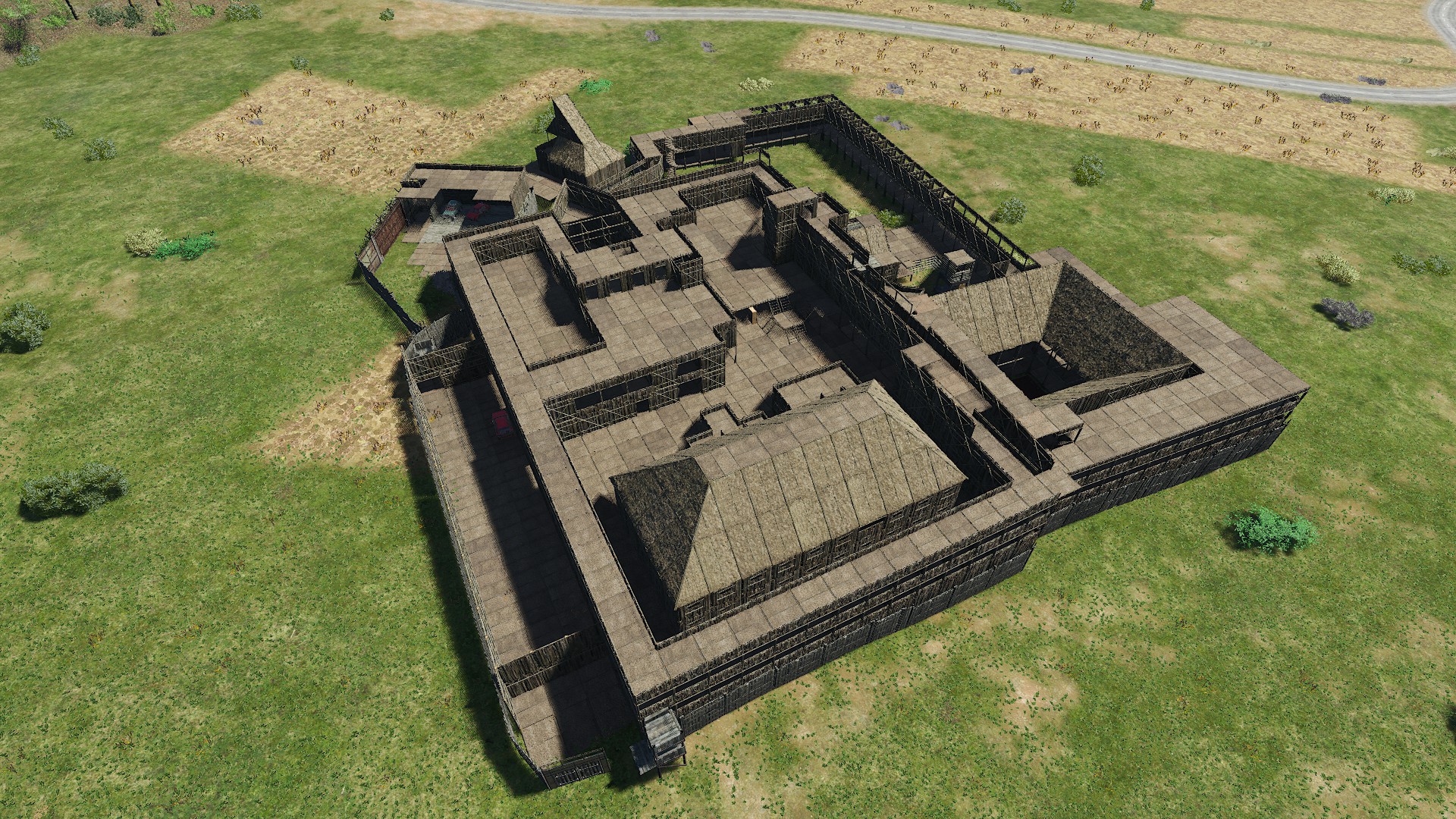 Ansonsten gibts nen Flugzeughangar (wenn man schon ein Flugzeugtor bauen kann...), ein vollständiger Umlauf, Farming erfolgt im rechten Nebentrakt unter der nach innen ausgerichteten Dachkonstruktion (ablaufendes Regenwasser und so.... da hatten mich wohl Römer oder Griechen inspiriert. Sieht hier halt scheisse aus ^^) Das Farmgebäude ist völlig abgeschottet. Selbst wenn mans mit nem Fallschirm in die Farmbase schafft, kommt man nicht weit.
