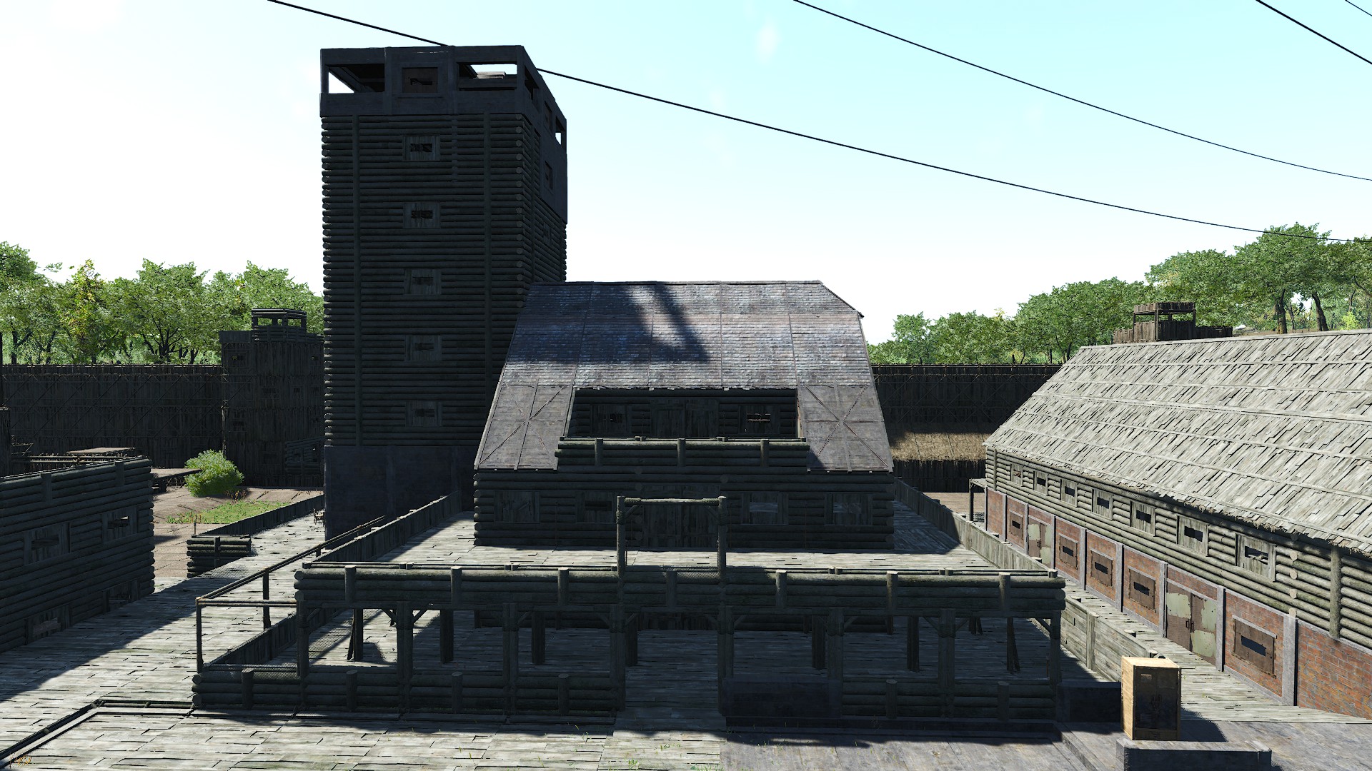 Lagerleitergebäude + zentraler Wachturm. Rechts das Hauptlager. Links lugt der Flugzeughangar frech ins Bild.
