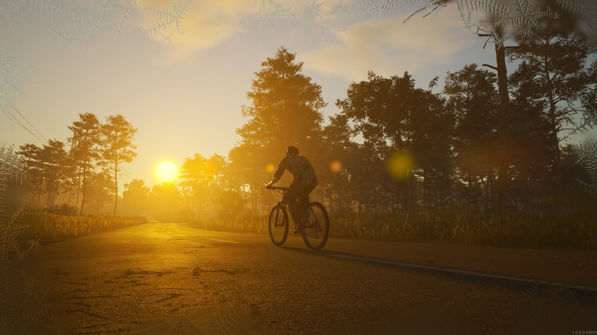 Ein einsamer Radfahrer fährt früh am Morgen auf einer stillen Landstraße, die sich durch sanfte Hügel schlängelt. Die Luft ist kühl und klar, noch durchzogen vom letzten Hauch der Nacht. Der Horizont glüht in warmen Orangetönen, während die Sonne langsam emporsteigt und goldene Lichtstrahlen durch den leichten Morgendunst schickt. Die Schatten sind lang, das Licht weich. Felder und Bäume erwachen in zartem Licht, während der Radfahrer in ruhigem Tritt der aufgehenden Sonne entgegenfährt ein Moment stiller Freiheit und neuer Hoffnung.